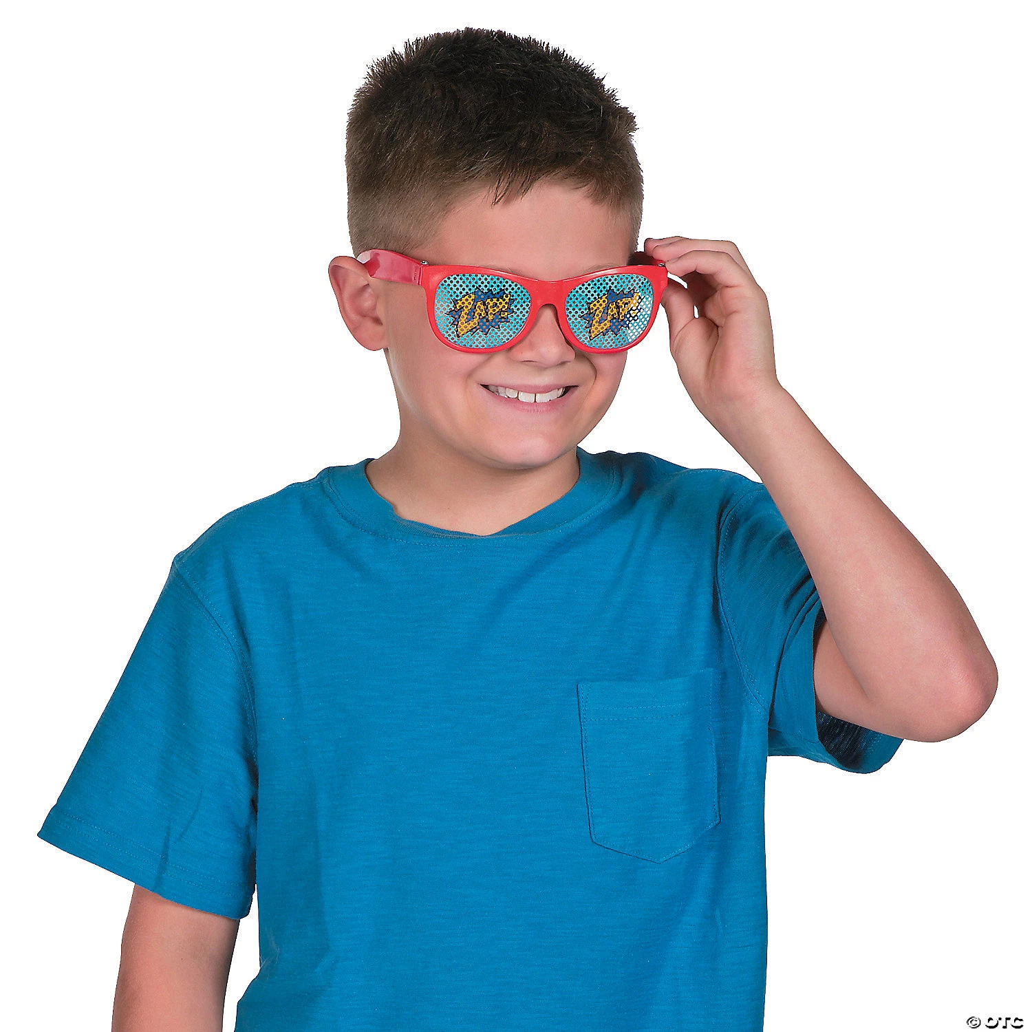 Save the day with these superhero party accessories. Each pair of these costume glasses features a superhero saying on the lens. “Bam”, “Zap” and “Wham!” your way to perfect party photo booths props, fun party favors or gifts for superhero fans. These plastic glasses may not leap buildings in a single bound but they add fun wherever they go and that’s what really counts.For novelty use only. 5 1/2″ x 1 3/4″ with 5 1/2″ ear pieces. © OTC