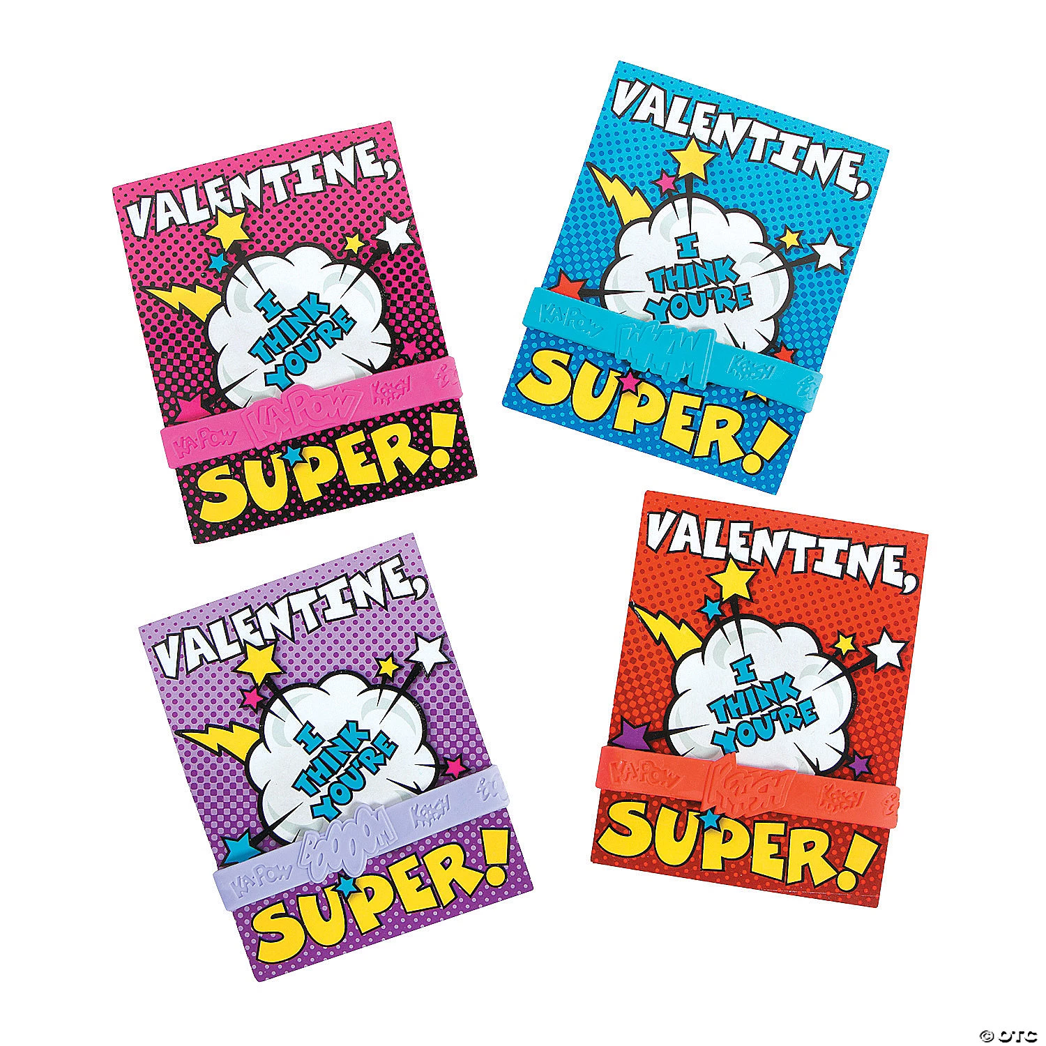 Give a super-sweet gift to a superhero friend this Valentine’s Day with these Valentine Superhero Cards, which come with power-packed bracelets! The trendy rubber bracelets are fun to trade and fun to wear! Including Valentine’s cards that you can personalize with a special message, these superhero bracelets are perfect party favors for school Valentine’s Day parties or just at small, friendly get-togethers. Cardstock. (2 dozen per unit) 3 1/2″ x 4 1/2″ cards with 7 1/2″ circ. rubber bracelets. Cards have To/From space on the back. © OTC