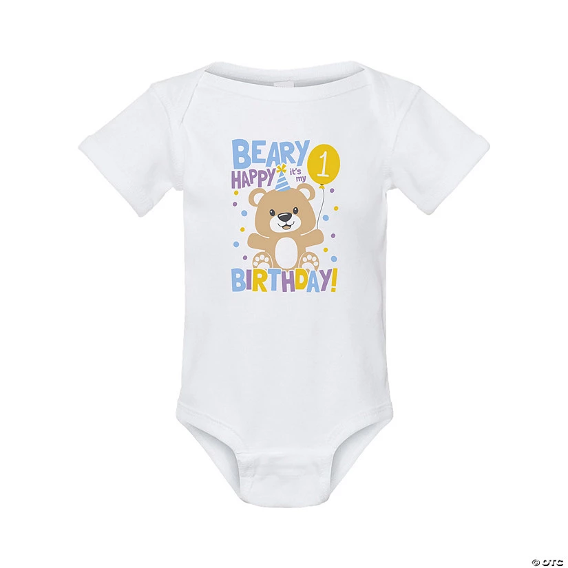Dress your little cub in this comfy bodysuit to show how beary happy they are to celebrate their first birthday! Featuring a smiling teddy bear and bright colors, this gender neutral t-shirt is just right for first birthday parties and other celebrations. © OTC