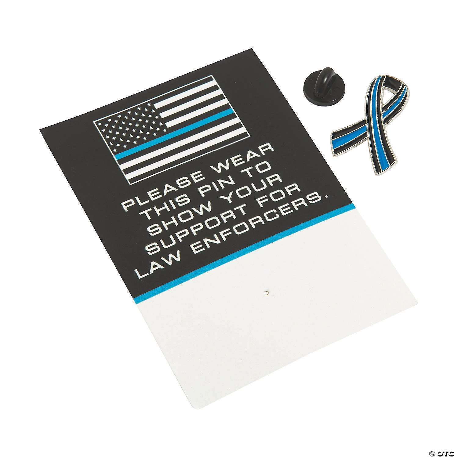 Wear your pride for the police with these Thin Blue Line Awareness Pins! The black and blue ribbon pins are attached to cards, so they make excellent giveaway items or guest favors for fundraising events. The cards are printed with an American flag with a blue line and a law enforcement awareness message. Each 1″ metal pin is on a 2 1/2″ x 3 3/4″ paper card. © OTC