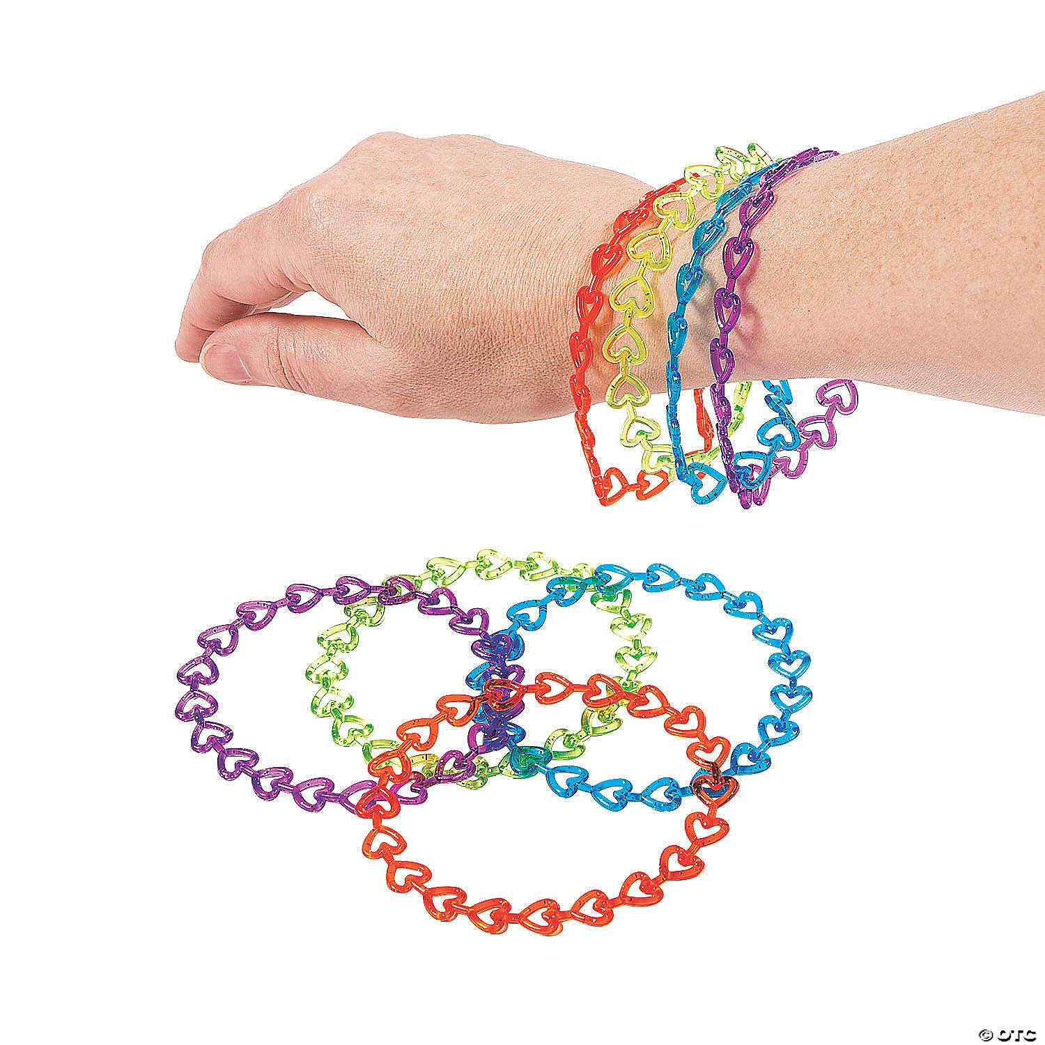 Layer, trade or collect these rubber heart bracelets during the month of February and all year long. As Valentine’s Day party favors or giveaways for friends, these rubber heart bracelets are fun and affordable valentine gifts for kids. Bracelets are always popular classroom rewards for girls and boys. (2 dozen per unit) 8″